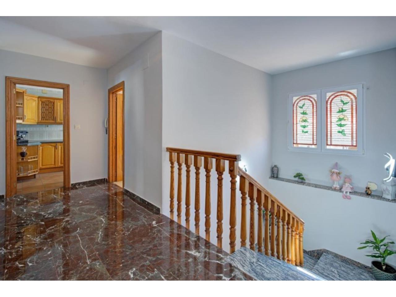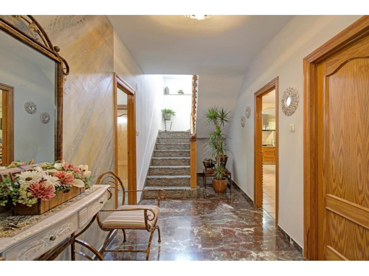 Destaca su amplio distribuidor con elegante escalera de granito, barandilla de madera tallada y vidrieras decorativas.